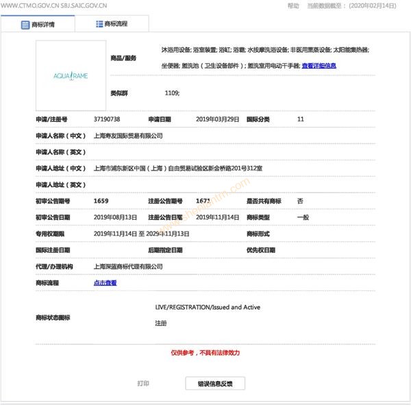 商標注冊證核定使用商品:沐浴用設(shè)備; 浴室裝置; 浴缸; 浴霸; 水按摩洗浴設(shè)備; 非醫(yī)用熏蒸設(shè)備; 太陽能集熱器; 坐便器; 盥洗池(衛(wèi)生設(shè)備部件); 盥洗室用電動干手器。